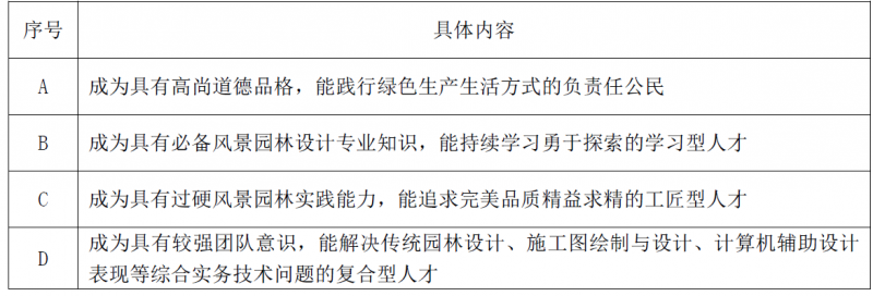 人才培养目标:本专业培养理想信念坚定、志向远大,崇尚绿色发展理念,德智体美劳全面发展,具有一定的科学文化水平,良好的人文素养、职业道德和创新意识,精益求精的工匠精神,较强的就业能力和可持续发展的能力;掌握本专业风景园林设计、园林计算机辅助设计、园林工程项目管理等知识和技术技能,面向风景园林专业的景观设计师助理、风景园林工程技术人员等职业群,能够从事传统园林设计、风景园林工程施工与管理、园林施工图设计等工作的高素质技术技能人才。本专业员工在毕业后3-5年预期能达到的目标见下表。